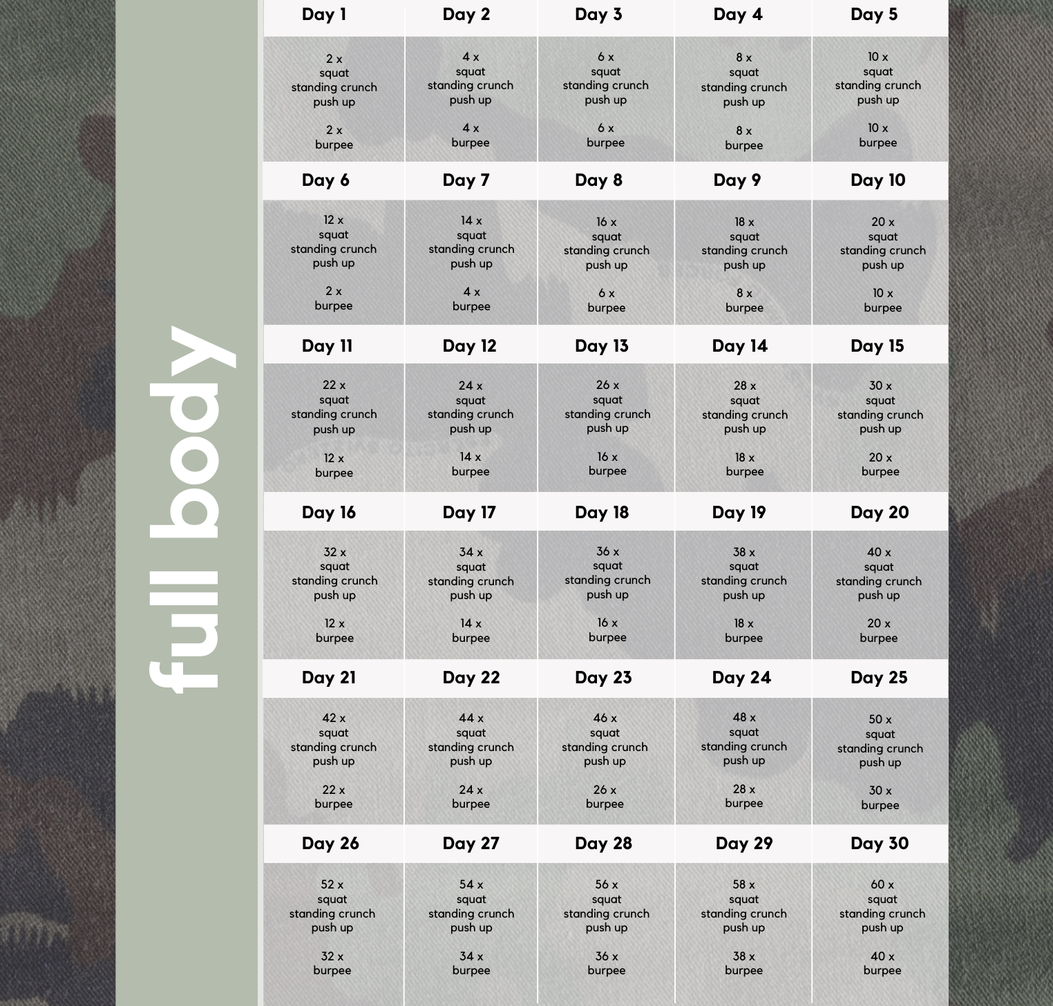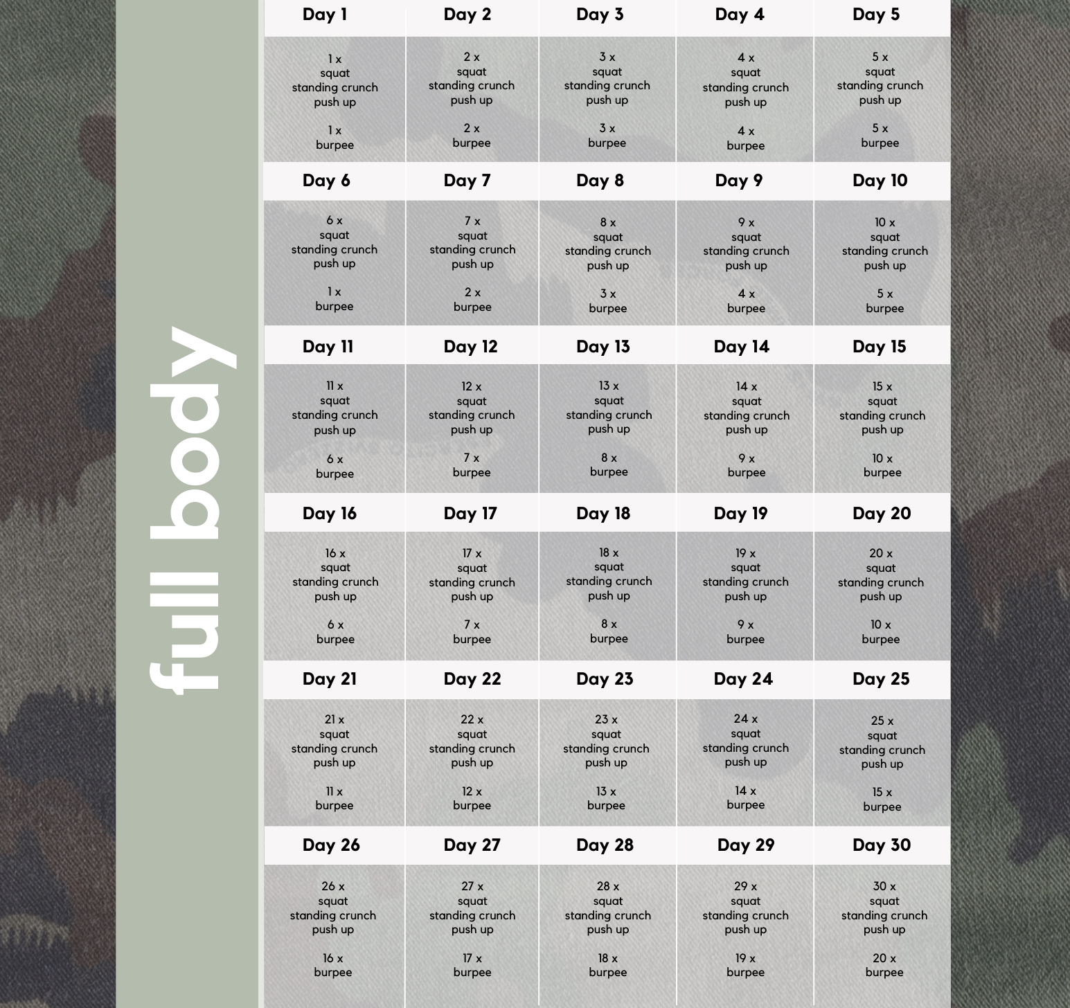 45 Sek. Belastung / 15 Sek. Pause / 4-5 Durchgänge - Montag: Unterkörper (Beine und Gesäss) - Dienstag: Oberkörper (Brust/Schulter) - Donnerstag: Körpermitte (Rumpfmuskulatur) - Freitag: Körpermitte (Rücken) - Samstag: Ganzkörper - Mittwoch/Sonntag: Pause