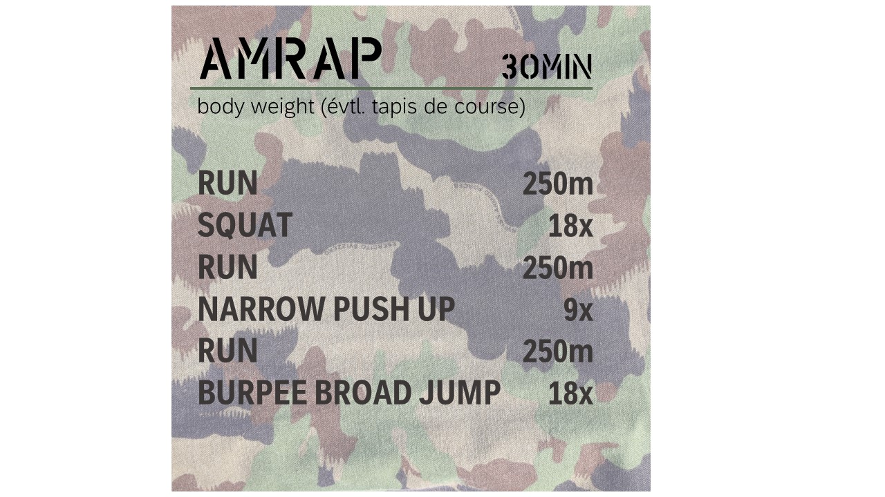 3 exercises plus 3 running sessions - AMRAP: as many rounds as possible in 30 minutes.