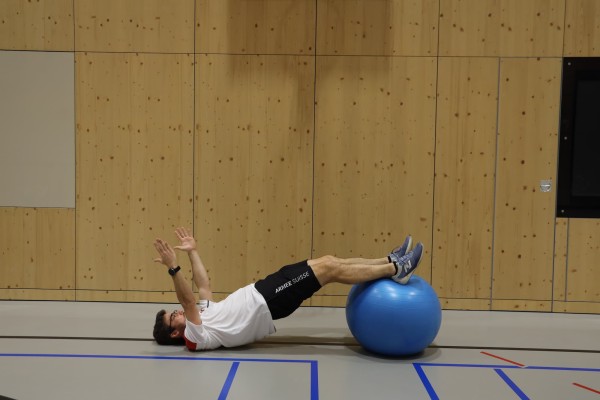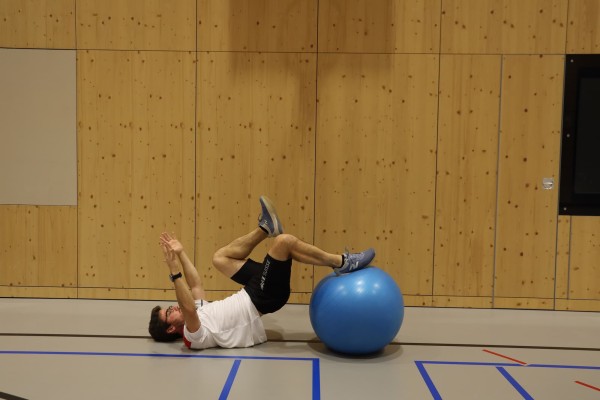 Prone position (upper body slightly raised or flat on the floor), arms bent (elbows approx. 90° at head height or slightly below), clamp the exercise ball between the legs, raise the lower legs (bring the exercise ball to the buttocks) and lower back to the starting position (movement only in the knee joint).