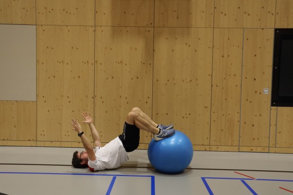 Shoulder position with legs stretched out on the exercise ball, arms resting at the sides on the floor, push hips up, bend legs (bring exercise ball to buttocks) and stretch back to starting position.