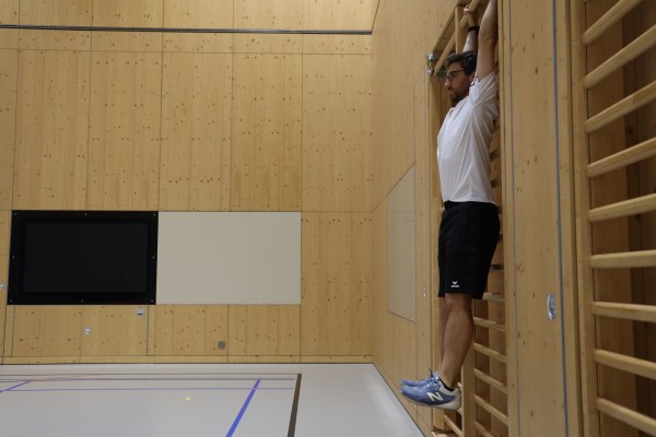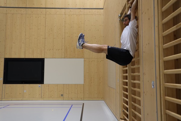 Hanging on the wall bars (back facing the wall bars), body stretched, legs bent and stretched (knees raised to hip height).