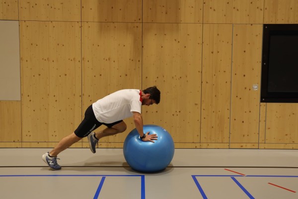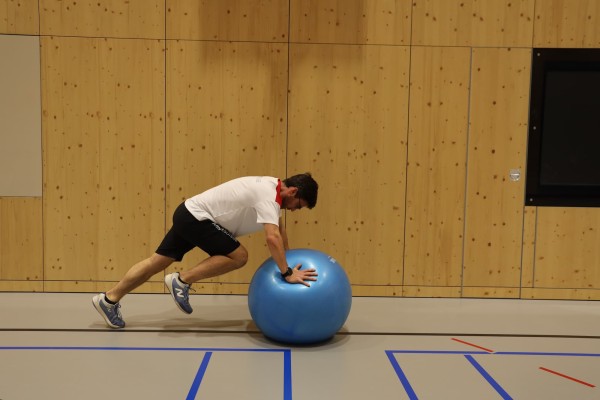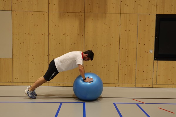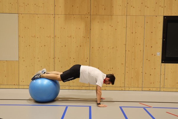 Head, shoulders, buttocks and feet form a line, no hollow back, actively tense the torso. To prevent the ball from rolling away, you can lean it against a wall.