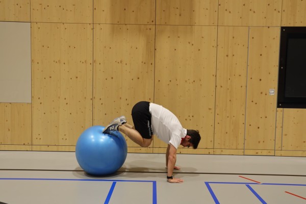 Push-up position, legs resting on the exercise ball (shins), alternately bring one knee to the arms (chest height)/bend the leg.