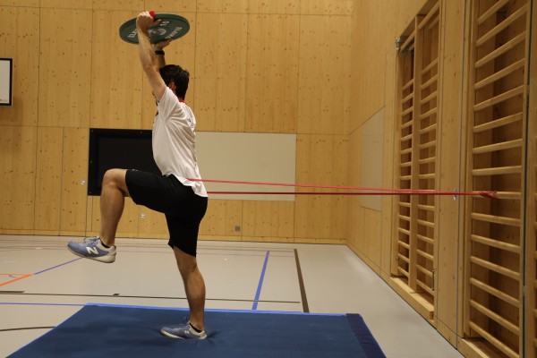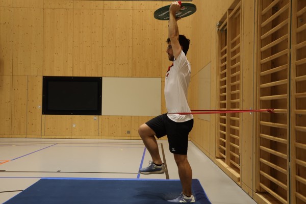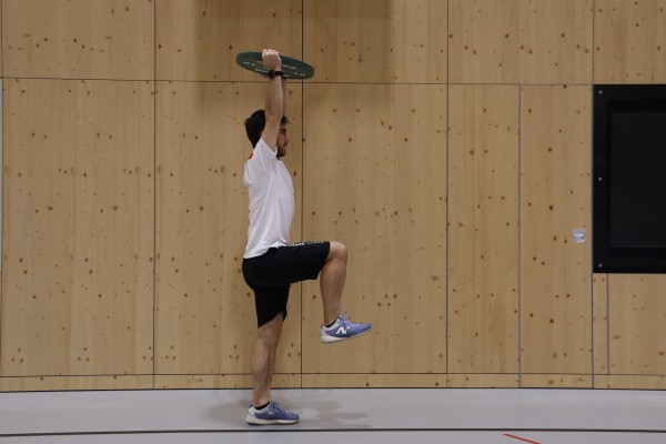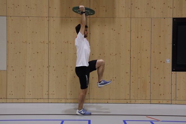 A fixed elasticated band (e.g. on the wall bars, on a post or candelabra) is worn around the hips. Move away from the attachment of the elastic band so that the band is well tensioned. Knee lift (lift your knees alternately with high intensity up to the level of your navel), holding a weight disc overhead with your arms almost outstretched.