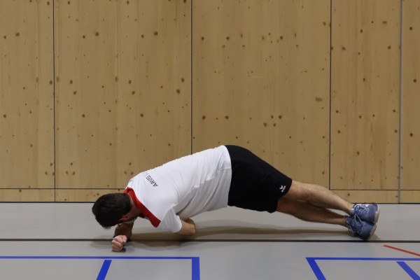 Side support on the (right) forearm and vertically extended upper arm, looking upwards, bring the upper arm under the body and back to the starting position, accompany the movement with your head (looking down from above).
