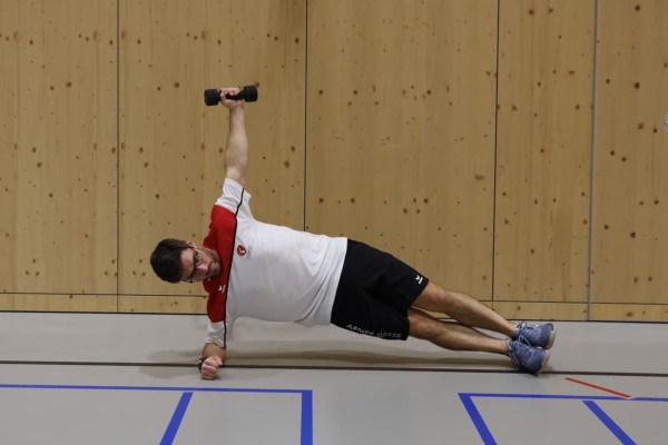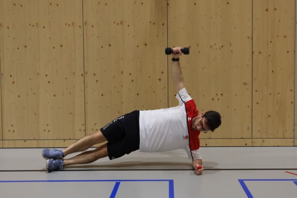 Side plank with the (right) arm extended, upper arm holding the dumbbell also extended (vertically upwards in a high position), look upwards, bring the upper arm under the body and back to the starting position, accompany the movement with your head (look down from above).