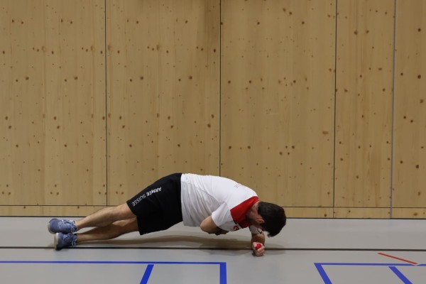 Side support on the (right) forearm and vertically extended upper arm, feet on the balance board, look towards the free arm, bring the playing arm under the body and back to the starting position, accompany the movement with your head (look from top to bottom).