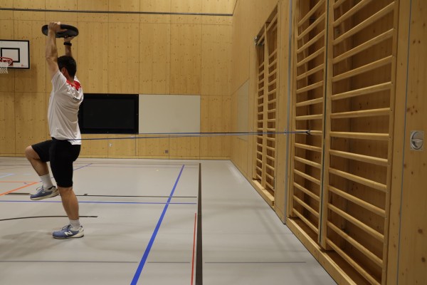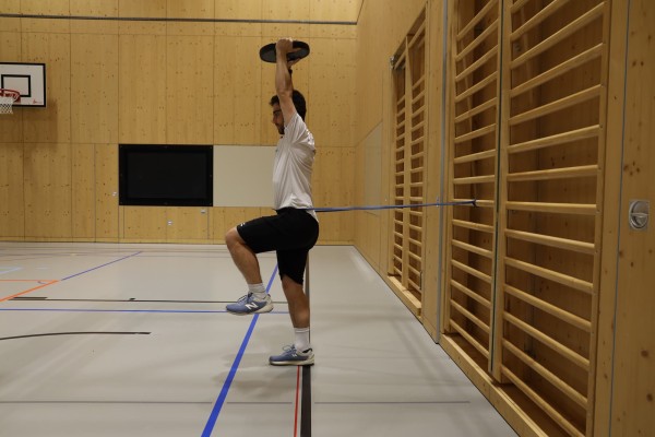A fixed elasticated band (e.g. on the wall bars, on a post or candelabra) is worn around the hips. Move away from the attachment of the elastic band so that the band is well tensioned. Knee lift (lift your knees alternately with high intensity up to the level of your navel), holding a weight disc overhead with your arms almost outstretched.