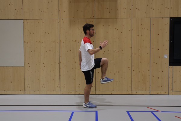 Stand upright and hip-width apart (starting position, then one leg always moving freely), alternately lift one knee straight up to navel height and lower it back to the standing position, swinging your arms along and supporting the movement (knee lift in place). The rhythm/intensity can be varied.