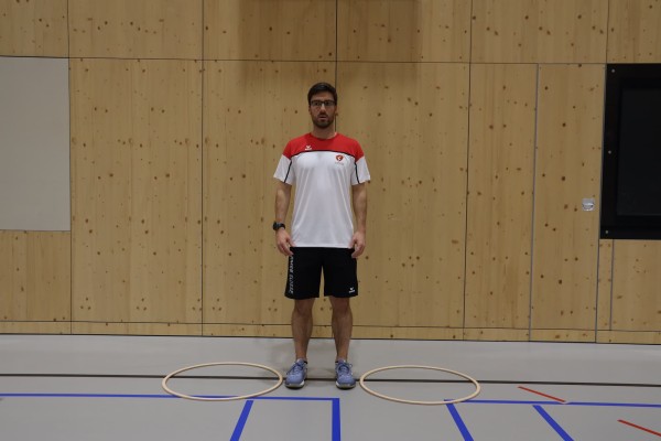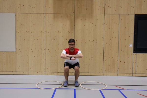 From the shoulder-width stance, move into a squat position (arms pointing diagonally downwards in front) and then drop into a supine position. The outstretched arms are extended overhead (along the floor) and the bent legs are stretched out so that they are pointing towards the sky (upwards). The arms are then brought in front of the body again in a flowing movement so that the momentum can be utilised to return to the standing position. When standing up, however, only one leg (left) is bent and placed on the floor, the other leg (right) remains practically straight and lifted off the floor. Finally, the standing leg (left) is also extended from the deep one-legged high position to reach the standing position. During the low squat position, the leg lifted off the floor (right) points horizontally forwards (low one-legged squat position) and in the subsequent upright stance points diagonally downwards forwards before the leg is brought back to the training leg (left) in the starting position in the shoulder-width stance on both legs.