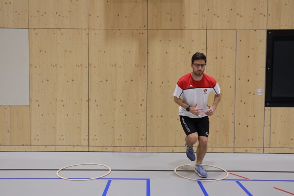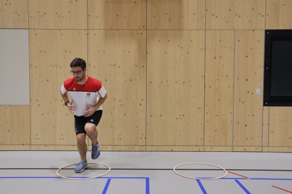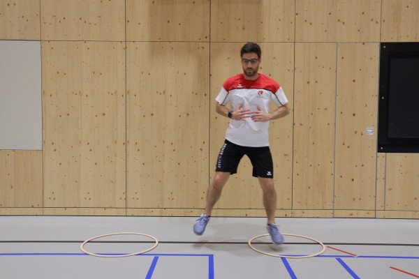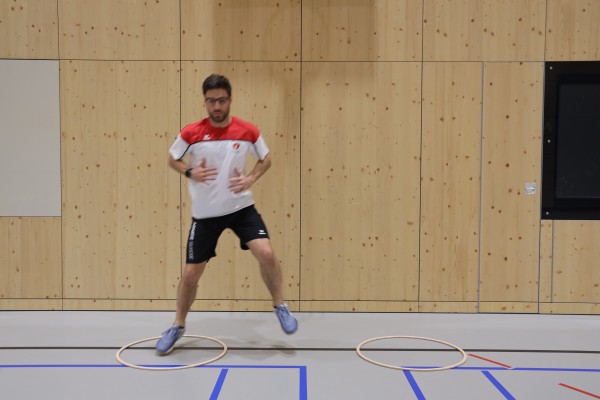 Stand on one leg (left) on an elevated surface (e.g. flat bench, vaulting box element incl. top, long bench), with the supporting leg on the elevation strongly bent (one-legged knee bend with less than 90 degrees in the knee joint) and the other leg also bent with the front foot slightly offset to the side on the floor, resting the arms on the hips. From this position, push the (lower) foot off the floor and stretch it, while at the same time stretching the raised foot so that the body is stretched in a one-legged stance (left). In a fluid movement, bend the raised leg (left) back to the starting position and move the free leg to the other side of the body (stand on the front foot again with the leg bent). In a continuous alternation, the free leg is spread slightly to the side and then crossed over/backwards behind the supporting leg to the other side.