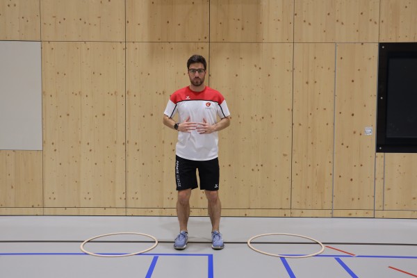 Stand upright with feet shoulder-width apart and arms slightly bent in front of the body.