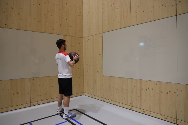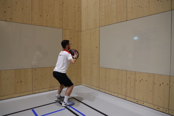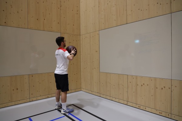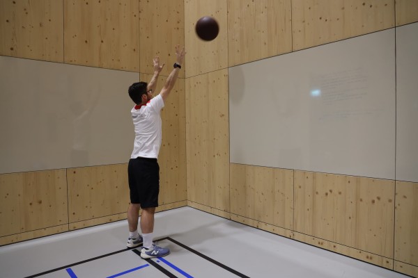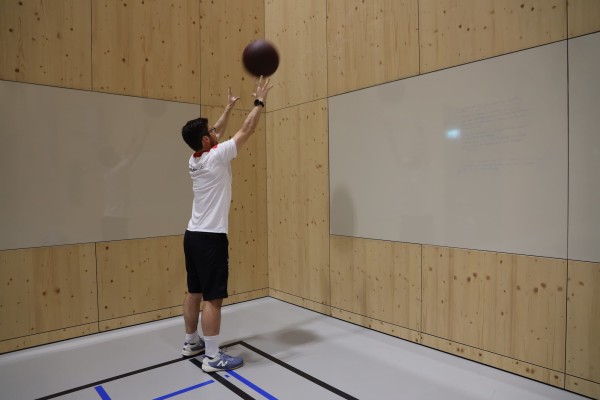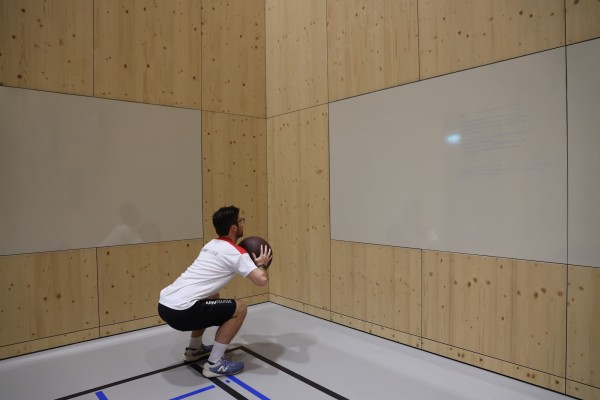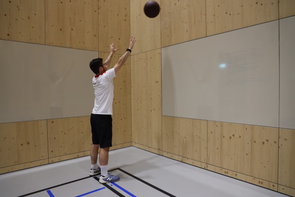 Stand upright shoulder-width apart in front of a wall (facing the wall) with your feet pointing slightly outwards, holding a medicine ball in front of your chest with your arms bent (elbows close to your body and pointing backwards, place both hands under the ball). Bend your knees and lower your buttocks as far as possible without losing stability in your back (always look forwards towards the wall in a neutral position). Then straighten your legs again and at the same time straighten your arms to powerfully push the ball upwards against the wall (utilise the momentum of your legs). Standing upright with your arms stretched upwards, catch the ball and return to the starting position by bending your arms to restart the exercise.