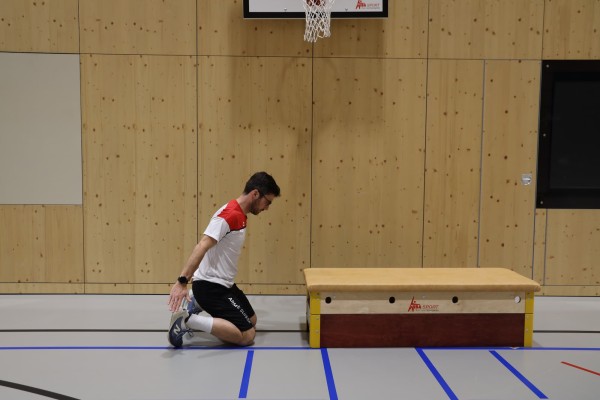 Stand on one knee, alternate between standing on one leg and assuming a deep squat position. From the squat position, tilt your upper body slightly forwards, stretch your arms backwards at an angle to your body (like a ski jumper on a ski jump), push off the floor powerfully to perform a jump onto a raised object (plyo box or swinging box element incl. top) (use the momentum of the arms), straighten your upper body (stand on the object) and jump back to the starting position (possibly the other side of the object), then return to the kneeling position. Change the starting leg with each execution.