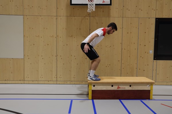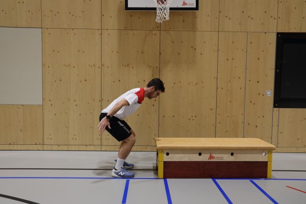 From a kneeling position, jump into a deep squat. From the squat, lean the upper body slightly forward, extend the arms diagonally backward along the body (like a ski jumper on the ramp), then push powerfully off the ground to perform a jump onto an elevated surface (plyo box or Swedish box element including the top), using the swing of the arms. Straighten the upper body while standing on the surface, then jump back to the starting position (possibly to the other side of the equipment) and return to the kneeling position.