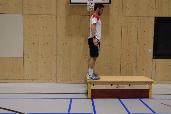 Stand shoulder-width apart in front of the plyo box (the vaulting box - 1 intermediate element plus top), arms supported on the hips, bent or in front at chest height, bend the knees to approximately a right angle in the knee joints (buttocks at about knee height) and stretch back to the starting position. Then step first with one leg, then with the other leg onto the object and back down to the starting position (climbing stairs). Then perform another squat before climbing the stairs again (change the starting leg after each exercise).