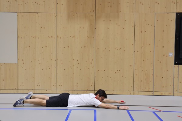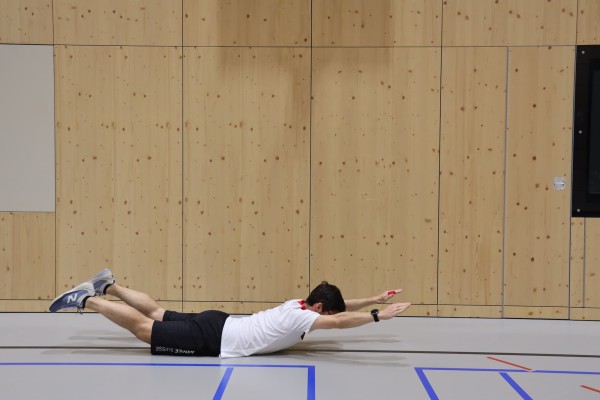 Lie on your stomach with your arms stretched out in front of you so that your body forms a line. The legs, also stretched out, touch the floor lightly, looking downwards (not forwards) to keep the cervical spine neutral. Tense your stomach, buttocks and lower back while lifting your arms, chest and legs slightly off the floor. Hold the end position briefly, then lower your arms and legs back to the starting position.