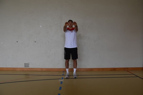 Position droite à largeur d'épaules, bras tendus vers l'avant (de face) à hauteur d'épaules, effectuer de petits cercles avec les bras dans les deux directions (à hauteur d'épaules).