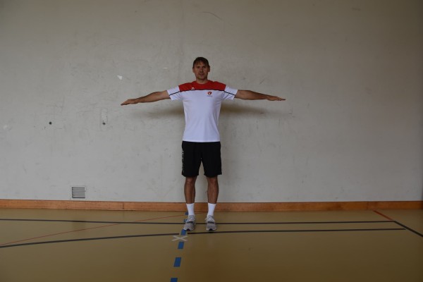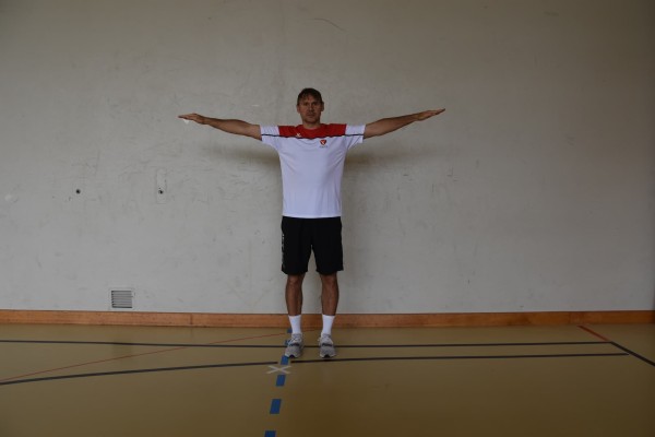 Position droite à largeur d'épaules, bras tendus latéralement à hauteur d'épaules, effectuer de petits cercles avec les bras dans les deux directions (à hauteur d'épaules).