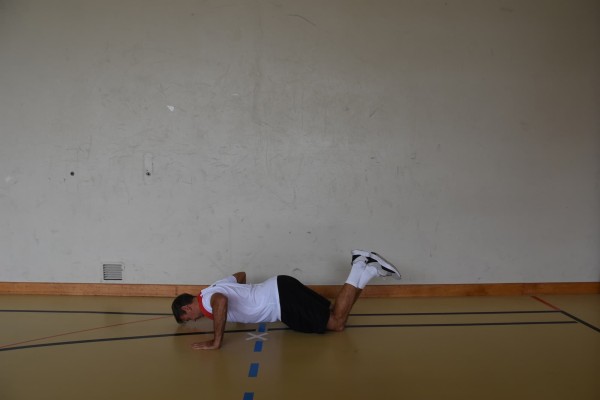 Rester seulement en position de pompes jambe levée; ne pas plier les bras.