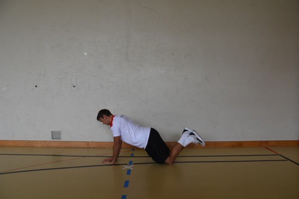 Position allongée, une main sur le sol et l'autre main en appui sur un médecine-ball/casque, les deux mains sont placées à peu près à la hauteur des épaules, le corps forme pratiquement une ligne droite (la tête est tenue dans le prolongement de la colonne vertébrale), fléchir les bras au niveau de l'articulation du coude, abaisser le torse vers le ballon (baisser et lever le torse) et revenir à la position de départ en tendant les bras. Après quelques répétitions (ou après chaque exécution), changer de côté.