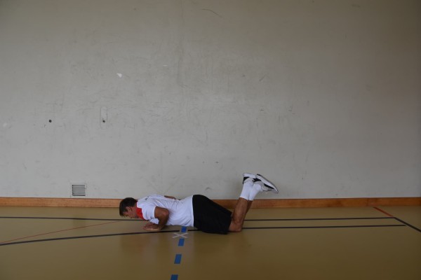 Les jambes sont alignées à peu près horizontalement par rapport au sol, à la largeur des épaules, sur un support surélevé (p. ex. plyo box, banc plat ou élément de caisson suédois, y compris la partie supérieure), les pieds sur les pointes de pied, les bras tendus sont placés sur le sol (un peu plus que la largeur des épaules) et soutiennent le haut du corps (la tête entre les bras). Les fesses sont maintenues pratiquement au-dessus de la tête (dos droit dirigé presque horizontalement vers le sol). Dans l'articulation de la hanche, il y a donc pour ainsi dire un angle de 90 degrés, de sorte que la position du torse ainsi que des jambes correspondent à la lettre "L". A partir de cette position, fléchir les bras (amener le front vers le sol) et revenir à la position de départ.