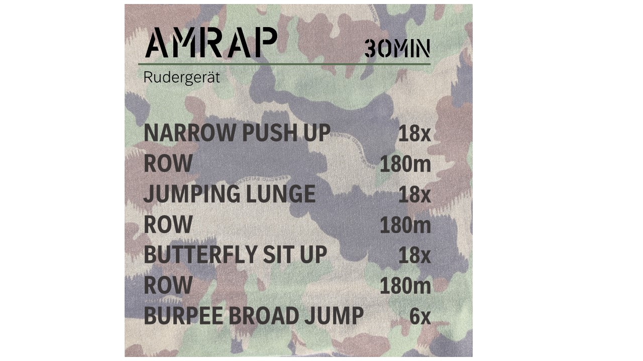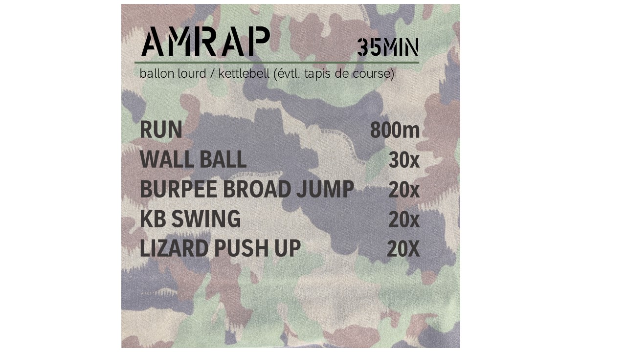 5 Übungen (inkl. Laufeinheit) - AMRAP: as many rounds as possible in 35 minuten (so viele Runden wie möglich in 35 Minuten)