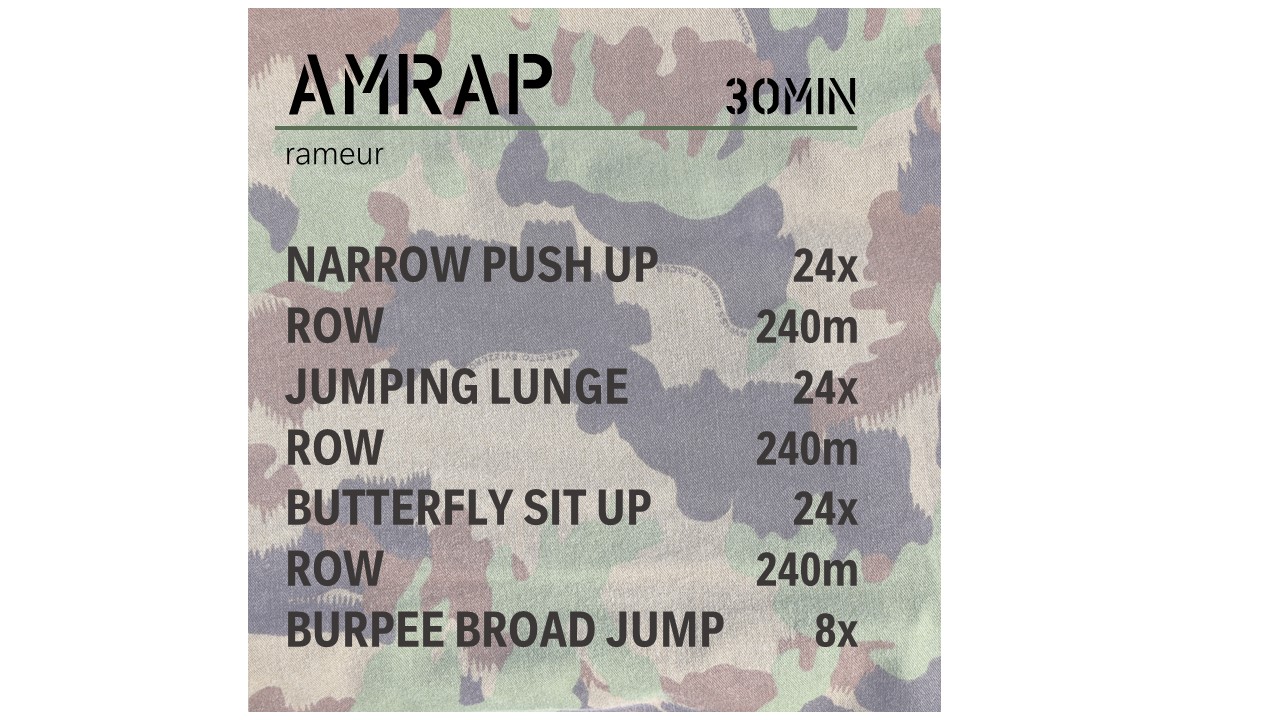 4 Übungen plus 3 Rudereinheiten - AMRAP: as many rounds as possible in 30 minutes (so viele Runden wie möglich in 30 Minuten)
