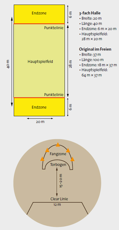 Rechteckiges Feld mit je einer Endzone an den Stirnseiten. Outdoor 64 x 37m mit 18m Endzone, indoor 40 x 25m mit 15m Endzone.