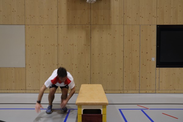 Sich im aufrechten Stand seitlich neben einen erhöhten Gegenstand (Plyo-Box oder Schwedenkastenelement inkl. Oberteil) stellen. Aus dem Stand die Beine beugen, die hände neben den Füssen absetzen um in die Hocke zu gelangen. Sich mit den Händen abstützen, Sprung mit beiden Beinen nach hinten, um in die Liegestützposition zu gelangen. Durch Beugen der Arme den Oberkörper vollständig ablegen (Bauchlage). Aus der Bauchlage mit beiden Armen zurück in die Liegestützposition drücken und zurück in die Hocke springen. Aus der Hocke, die Beine kraftvoll vom Boden abstossen, um einen Seitwärtssprung auf den erhöhten Gegenstand auszuführen (Schwung der Arme nutzen). Ohne den Oberkörper aufzurichten sowie die Beine zu strecken (wiederum Position in der Hocke), erfolgt sogleich ein neuerlicher Hüpfer auf die andere Seite des erhöhten Gegenstandes. Nach der Landung (kein aufrechter Stand nötig) wird die Übungsabfolge aus der Position in der Hocke neu gestartet, um anschhliessend zurück in die Ausgangslage zu springen.