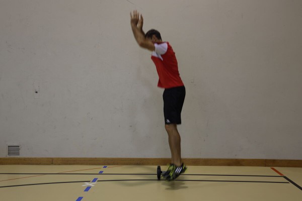 De la position debout, fléchir les jambes et poser les mains à côté des pieds pour se mettre en position accroupie. S'appuyer sur les mains, sauter en arrière avec les deux jambes pour se mettre en position de pompes. Poser complètement le haut du corps en pliant les bras (position ventrale). Depuis la position ventrale, pousser avec les deux bras pour revenir à la position de pompes et sauter à nouveau en position accroupie. En position accroupie, le haut du corps est légèrement incliné vers l'avant, tendre les bras vers l'arrière en oblique le long du corps (comme un sauteur à ski sur le tremplin), pousser vigoureusement du sol pour effectuer un saut (latéral-latéral) par-dessus l'haltère court (utiliser l'élan des bras). Redresser le haut du corps et recommencer l'exercice (prendre la position de pompes) pour finalement rebondir à la position de départ.