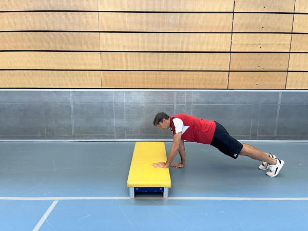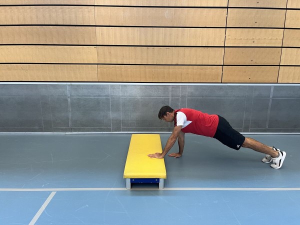 Appuyer sur place (évent. Soulever légèrement les bras en alternance) ; remplacer le déplacement des bras sur la partie supérieure du caisson suédois par un autre exercice comme, par exemple, en position de pompes, toucher les épaules en alternance avec la main en croix ou tendre le bras vers l'avant.